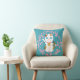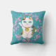 Blauwgroen gooi kussen met japans manekineko gelukkige calico kat omringd door kersenbloesems. Op het medaillon om de nek van de kat staat "daikichi", wat veel geluk betekent. De vis die de kat vasthoudt, is ook een symbool van geluk. En de calico kat is de gelukkigste manekineko van allemaal. Dus dit is een gelukkig kussen!