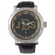 Zwart en gouden monogram horloge voor verfijnde heren- Mode accessoire voor managers en professionals- Gepersonaliseerde luxe monogram in goud op zwarte achtergrond met elegante faux zwart leder en gouden metallic look rand. Gecentreerd is een vet, jumbo, op maat gemaakt 3 letters monogram in gouden tint. Perfect gepersonaliseerd cadeau voor leidinggevenden, mannelijk cadeau voor hem, stijlvol horloge voor papa op Vaderdag of zijn verjaardag, of verfijnd pensioencadeau voor hem. Opmerking: alle afbeeldingen zijn gedrukt. Geen echt leer of metalen. Goud metallic look klok gezicht nummers. We hebben deze mannelijke leerstijl ook op andere mannen. Bezoek gewoon onze online Zazzle-winkel voor andere monogegrammeerde initialen en gepersonaliseerde horloges voor mannen.
