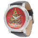 Mannen kersthorloge met zwarte lederen band. Dit horloge is versierd met een kerstboom en toont de tijd op elegante wijze op je pols en kan ook als cadeau worden gegeven.