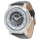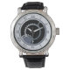 Een mannelijk horloge ontwerp met versnellingen over een zwarte achtergrond en aantrekkelijke Romeinse cijfers.