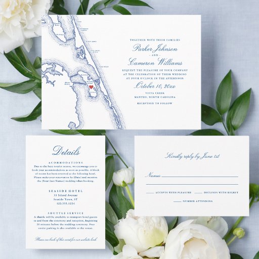Vier uw speciale dag met onze elegante marineblauwe Outer Banks kaart thema bruiloft uitnodiging, perfect voor uw Manteo, North Carolina bruiloft. Met een charmant ontwerp dat de schoonheid van het eiland Roanoke benadrukt, geeft deze uitnodiging de toon aan voor een viering die geïnspireerd is op de kust. Of u nu geloften uitwisselt aan de kust van Elizabethan Gardens, het schilderachtig Roanoke Island Festival Park, het pittoreske Marshes Light, het pittoreske Tranquil House Inn, het intieme Island Boerderij of de serene Vista Creek, deze uitnodiging geeft de essentie van uw bruiloft aan de kust weer. Bestel vandaag nog jouw exemplaar en laat het avontuur beginnen!