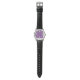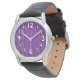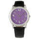Dit mannen horloge heeft een geometrisch Mardi Gras-ontwerp van een soort vlakke eicellen die zich over het ontwerp in goud en groen herhalen op een paars veld.