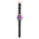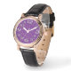 Dit vrouwenhorloge heeft een geometrisch Mardi Gras-ontwerp van een soort vlakke eicellen die in goud en groen op een paars veld herhalen.