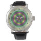 Als je van Mardi Gras houdt, zal dit ontwerp geweldig voor je zijn. Het heeft tinten van groen, goud en paarse gerangschikt in ringen van donker naar licht die de cirkel een 3D-look geeft. Dit horloge is verkrijgbaar in verschillende maten en stijlen, waaronder zowel kinderen als volwassen maten.