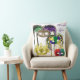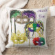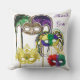 20 x 20 inch gooien kussen met een afbeelding van vier kleurrijke Mardi Gras-maskers voorzien van heldere veren, sequenties en glitter op wit. Optionele tekst. Paarse rug. Zie het hele collectie Mardi Gras Pillow in de DECOR | Afdeling Kussens.