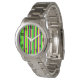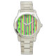 Dit vrouwenhorloge heeft een eenvoudig Mardi Gras ontwerp van verticale strepen in geel, groen en paars.