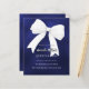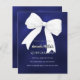 Een marineblauwe, ongelijke gekleurde achtergrond, versierd met een grote witte boog. Personaliseer en voeg een naam en partijgegevens toe. 1 vel = 1 uitnodiging bedrukt rand tot rand.