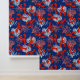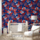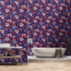 Stijlvolle peel en stick donkerblauw behang patterend met rode kreeften en roze en wit koraal