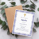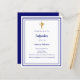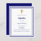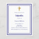 Een witte achtergrond, versierd met een marineblauw lijst, en een gouden kruis Personaliseren en voeg de naam en gegevens. Marineblauwe tekst. 1 vel = 1 uitnodiging bedrukt rand tot rand.
