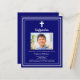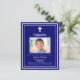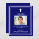 Een marineblauwe achtergrond, versierd met een wit lijst, en een wit kruis Personaliseren en voeg een foto naam en details. Witte tekst. 1 vel = 1 uitnodiging bedrukt rand tot rand.