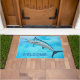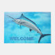 Blauw marlin doormat met blauwe waterachtergrond en "welkome" tekst. Een grote vis is het afbeelding op de slaapmutsen die in twee maten worden aangeboden. De "welkome"tekst wordt gedrukt langs de bodem en kan worden veranderd of worden geschrapt. Een andere doopvont kan op het "aanpassen verder"gebied worden gekozen.