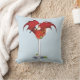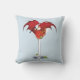 Een schattige kleine rode draak knuffelt naar een groene olijf in een martini glas in een achtergrond van blauw