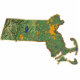 Deze magneet, gevormd als de staat Massachusetts, toont een reliëfkaart van de staat omringd door een gouden effect grens. Massachusetts decor voor je koelkast.