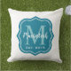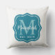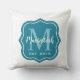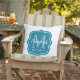 Stijlvol vierkant ontwerp met kussen in de buitenlucht biedt een modern blauwgroen blauw decoratief lijst met aangepast aqua blauw en wit monogram ontwerp. Personaliseer uw achternaam/initiaal en het jaar dat u hebt vastgesteld, dat het gehuwde jaar of het jaar van de geboorte van het eerste kind kan zijn. Witte achtergrond.