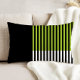 Deze trendy moderne kussen zijn voorzien van grote rechthoekige kleurblokken in kalkgroen, zwart en wit, met een patroon van zwarte strepen op de kalkgroene en witte achtergrondgebieden.