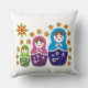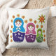 Matryoshka Russische nestelpoppen & zonnebloemen op maat gegooid kussen ontwerp met kleurrijke Matryoshka of Matroska Russische volkskunst poppen in blauw, groen en roze-paarse met bloemen en rond hen zonnebloemen.