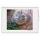 Max de kat, een grijs kat met kalkgroene ogen, zittend door een groen plant op roestachtige oranje stenen die omhoog kijken.