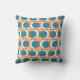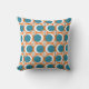 Dit werpt kussen heeft een modern ontwerp uit de midden eeuw van open oranje cirkels met stevige blauwgroen cirkels die over het patroon lopen met blauwgroen verticale lijnen en oranje horizontale lijnen.