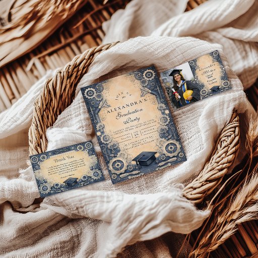 Celebrate a major academic milestone with this refined mechanical engineering graduation design, inspired by technical precision and traditional academic aesthetics. Featuring detailed gear illustrations, mechanical elements, graduation caps, and a warm parchment background, the artwork reflects discipline, problem-solving, and years of focused study.