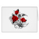 Contour, mechanische maansikkel met tandwielen, versierd met rode rozen met zwarte stekelige stelen en bladeren op witte achtergrond. Steampunk