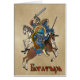 Een afbeelding van een gevecht tussen een Russische bogatyr en een Aziatische krijger, beide op de horeca. Ook de Cyrillische (Russische) tekst met de tekst "Б а ы р" (Bogatyr) wordt weergegeven. Bogatyri zijn heroïsche personages uit middeleeuwse Slavic epics. Ze lijken op de ridder van de Westerne literatuur. De meeste verhalen over bogatyri draaien rond de rechtbank van Vladimir I van Kiev (958-1015). Sommige bogatyri zijn verondersteld historische cijfers te zijn. Bogatyri beschermde Russisch land en mensen tegen indringers, vooral Tatars. Sommigen kregen bevoegdheden en kracht die bijna goddelijk waren. " Пс овnognog Golden City Kiev en de Grote Scourging van het Russische Land) door Tamara Likhiotal; gepubliceerd in de USSR in 1974.