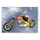 Een blond meisje dat over een motorfiets met sterren en wolken op de achtergrond ligt.