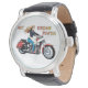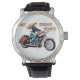 Mooi meisje, rijden op een prachtige motor in droomwegen. Een ontwerp dat snelheid en vrijheid uitdrukt.