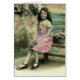 Verkleurd ouderwets briefkaart van een meisje dat op een bank zit met wilde bloemen in een mand en een bouquet.