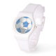 Blauw-wit voetbal horloge voor een meisje voetballer, met een plaats voor haar naam in zwart script. Dit is het perfecte aangepaste cadeau voor een jong meisje of tiener. De kleur van de band kan worden veranderd van roze naar rood of wit, of het uiterlijk van het horloge volledig veranderen.