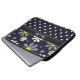 Een laptophoes van 15 inch met een korrelig patroon met een zijdebloem bovenaan met witte mazen met gele centers tegen een blauw marinesolf en een trendy blauw en wit puntpatroon onderaan. Personaliseer u door jouw naam toe te voegen. Perfect cadeau voor een stijlvol meisje.