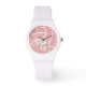 Dit sportieve volleybalhorloge bevat een minimalistisch volleybalgrafisch (alleen weergegeven door de volleybalseams in wit) dat een roze, chic, digitaal gemaakte textuur overdekt - aanpasbaar met haar naam en monogram of jersey nummer - door katz_d_zynes