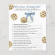 Een klein koekje is onderweg! Waterverf baby shower partij. Waterverf koekjes met chocola en flessenmelk met blauwe strik.