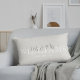 Op maat ontworpen huwelijkscadeau meneer en mevrouw lumbale kussen voor de pasgetrouwden met modern beige ontwerp met gepersonaliseerde familienaam en datum.