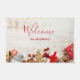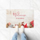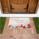 Welkom deurmat met een rustieke foto. Een lichtbruin houten plankje met diverse kerstelementen langs de bodem.