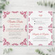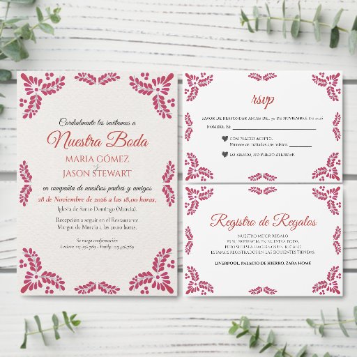 This Mexican Talavera Red Floral Minimalist Wedding Save the Date design features a minimalist approach with delicate, symmetrical red floral motifs placed in each corner and along the edges. The small, leaf-like shapes create a sense of movement while maintaining an airy, open space in the center, allowing for ample text placement. The simplicity and elegance of the pattern evoke traditional Talavera tiles, giving the design a classic Mexican artisanal feel.