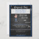 Mic Drop Retirement Party Invitation. Dinner, drinken, hotel, rsvp. Zwarte houtachtergrond. Blauw en wit lettertype.