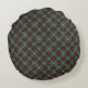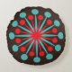 Dit ronde kussen beschikt over Mid Century moderne stijl starburst motieven in turquoise en rood en een coördinerend patroon op de achterkant alles ingesteld tegen een bruine achtergrond die kan worden aangepast aan uw decor.