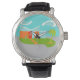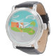 Deze Mid Century Modern Cartoon House Mannen Watch zal je willen om de Welcome mat uit te zetten en jezelf thuis te maken! Het minimalistische kunstontwerp uit de jaren zestig heeft een strak, oranje stenen en aquaglassehuis op een weelderig, groen, boemerang gevormd gazon. Het gazon vormt een oase in het midden van zijn grijze, betonnen omgeving. Een groene palmboom zwaait in de wind. Vier, oranje trapstenen leiden de weg naar de retro, rode, voordeur met drie rechthoekige, glazen raampanelen. Links van de deur is een turquoise bloempot voorzien van een tropisch, groen plant. Het huis heeft een schuin, V-vormig wit dak dat naar twee, witte, nierbonenvormige wolken wijst. De lucht is een positief serene schaduw van aqua. Niemand zal stenen willen gooien uit dit moderne, glazen huis ontwerp! Koop dit kitschy, space age product en wees de coolste kat op uw blok!
