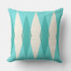 Dit Mid Century Modern Argyle Outdoor Sierkussen is voorzien van een levendige, turkooisachtergrond en een patroon van gemene, doorschijnende blauwgroen diamanten die grotere, roomdiamanten overdekken met gouden kleurige, ruimtesuikers. Deze minimalistische geïnspireerde, gedeconstrueerde argyle is een simplistische terugval van het grotere atoomtijdperk dan het leven dat het decoratieve landschap van de jaren vijftig en zestig domineerde. Dit kitschy ontwerp doet denken aan alles, van de bowlingsteegjes van de Palm Springs tot de televisieschermen die je bij je oma gebruikte.