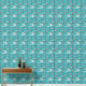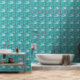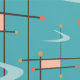 Dit behang is voorzien van een midden eeuw modern patroon van boemerangs en kruisende lijnen in turquoise, blauw en roze voor een retro jaren 1950 look.