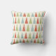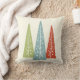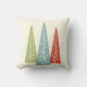 Dit kerst thema kussen heeft een illustratie van een trio van groenblijvende bomen in een eenvoudige, moderne stijl in lichtgroen, lichtblauw en rood tegen een crèmekleurige achtergrond. De achterkant heeft een coördinerend all over patroon van bomen.