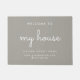 Mijn Huis Onroerend goed Welkom Warme Grijze Realtor Deurmat. Introductie van een eigentijdse deurmat sjabloon voor uw vastgoedaanbiedingen, ontworpen met een casual en handgeschreven scriptlettertype tegen een chique zwarte achtergrond. Personaliseer het moeiteloos met jouw namen en contactgegevens, waaronder uw telefoonnummer, e-mail, sociale-mediaprofielen en meer. Deze deurmat is de ideale aanvulling voor elke makelaar of vastgoedbeursbureau, en maakt een stijlvolle en praktische verklaring voor de deur!