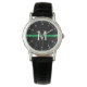 Dit dameshorloge heeft een dunne groene lijn. Het heeft een horizontale groene streep op een zwarte achtergrond over het midden van het horloge en een monogram initiaal in wit voor u om te personaliseren. Het heeft ook witte cijfers en lijnen voor seconden en uren. Een uniek persoonlijk cadeau voor familie en vrienden in het leger, parkwachters, natuurbeschermers en grenspatrouille.