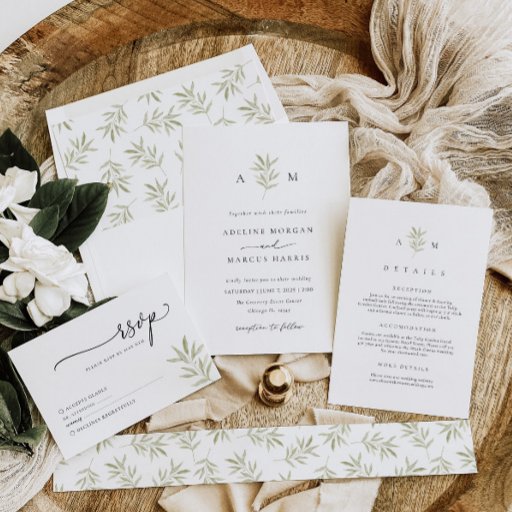 Vier je liefdesverhaal met deze tijdloze en verfijnde huwelijksuitnodiging met een delicaat olijftakmonogram en schone moderne typografie. Perfect voor koppels die natuurlijke elegantie en een minimaal ontwerp waarderen. Deze uitnodiging belicht uw initialen in een sierlijk serif lettertype boven een zacht groen motief, met klassieke zwarte tekst op een heldere witte achtergrond. Ideaal voor tuinbruiloften, rustieke chique feesten of moderne minimalistische ceremonies.