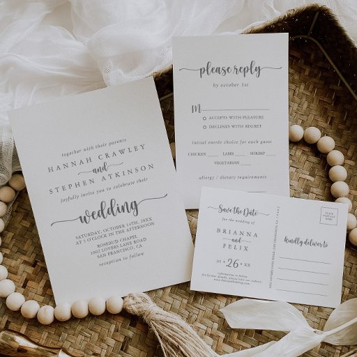Deze minimalistische zilveren bruiloft in één uitnodiging is perfect voor een rustige bruiloft. Het eenvoudige en elegante ontwerp kenmerkt klassieke en fancy manuscripttypografie in zilver. Bespaar papier door meer details op te nemen in de uitnodiging in plaats van op een aparte bijsluitkaart.