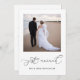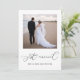 Minimale moderne huwelijksreis-aankondigingskaart om vrienden en familie te laten weten dat de plannen voor je bruiloft zijn veranderd en dat je bent weggelopen. Op de voorzijde staan je trouwfoto en "net getrouwd" onder in een stijlvol script met een klein hart boven de "j" en de "i". U kunt uw voornamen toevoegen aan de naam van de heer & mevrouw. Aan de achterkant kunt u uw bericht meer in detail personaliseren, met inbegrip van om het even welke viering later wanneer de tijd juist is.