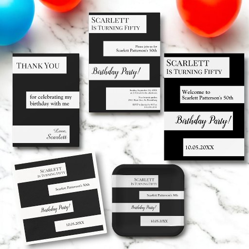 Deze elegante zwart-witte verjaardagsuitnodiging is perfect voor een moderne verjaardag. het eenvoudige ontwerp is voorzien van elegante zwarte kalligrafie op een wit gestreepte achtergrond.