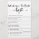 Deze schattige Wie Kent De Bruid Het Best Kaarten zijn een leuke activiteit voor een Bruidsfeest. Geef ze gewoon rond tijdens het feest waar de gasten lol zullen hebben met het beantwoorden van vragen over de aanstaande bruid! De persoon met de meeste correcte antwoorden wint!