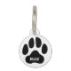 Eenvoudig zwart-wit gepersonaliseerd huisdier ID-label. De minimalistische ontwerpstijl omvat een grote illustratie met zwarte pootafdruk met een aangepaste huisdiernaam die in het wit over de poot is gedrukt. De achterkant heeft nog een aangepaste tekstsectie die u kunt gebruiken om uw telefoonnummer of andere contactgegevens toe te voegen.
