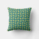 Het ontwerp van het kussen in een patroon van gele driehoeken met blauwe vierkanten willekeurig verdeeld over een groene basiskleur.